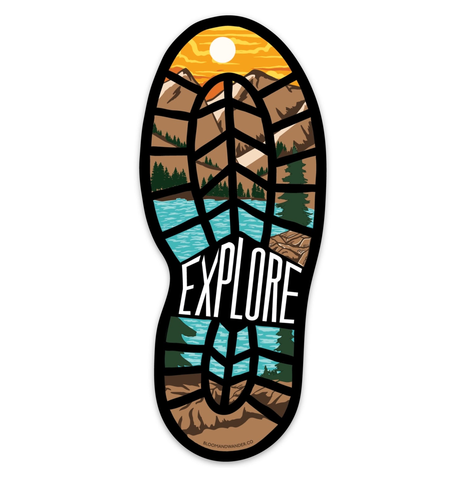 Explore Boot Print Sticker - Mountain Lake Sunset Get outside and Explore!