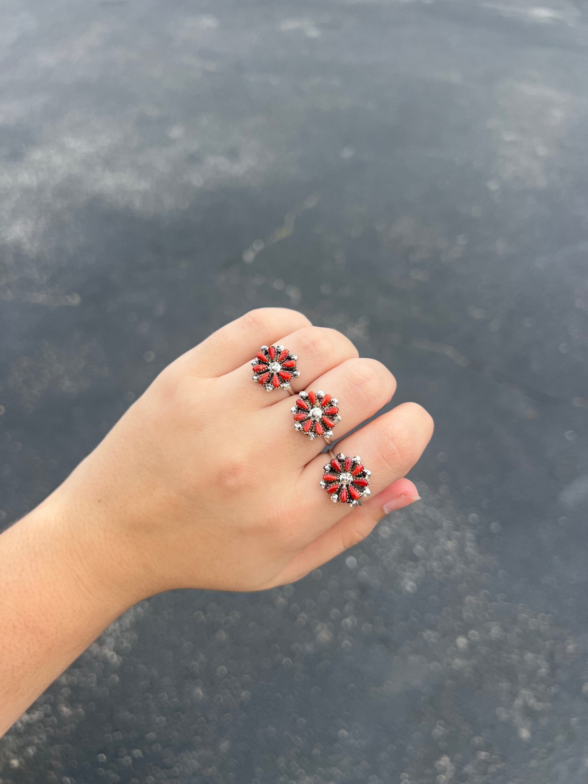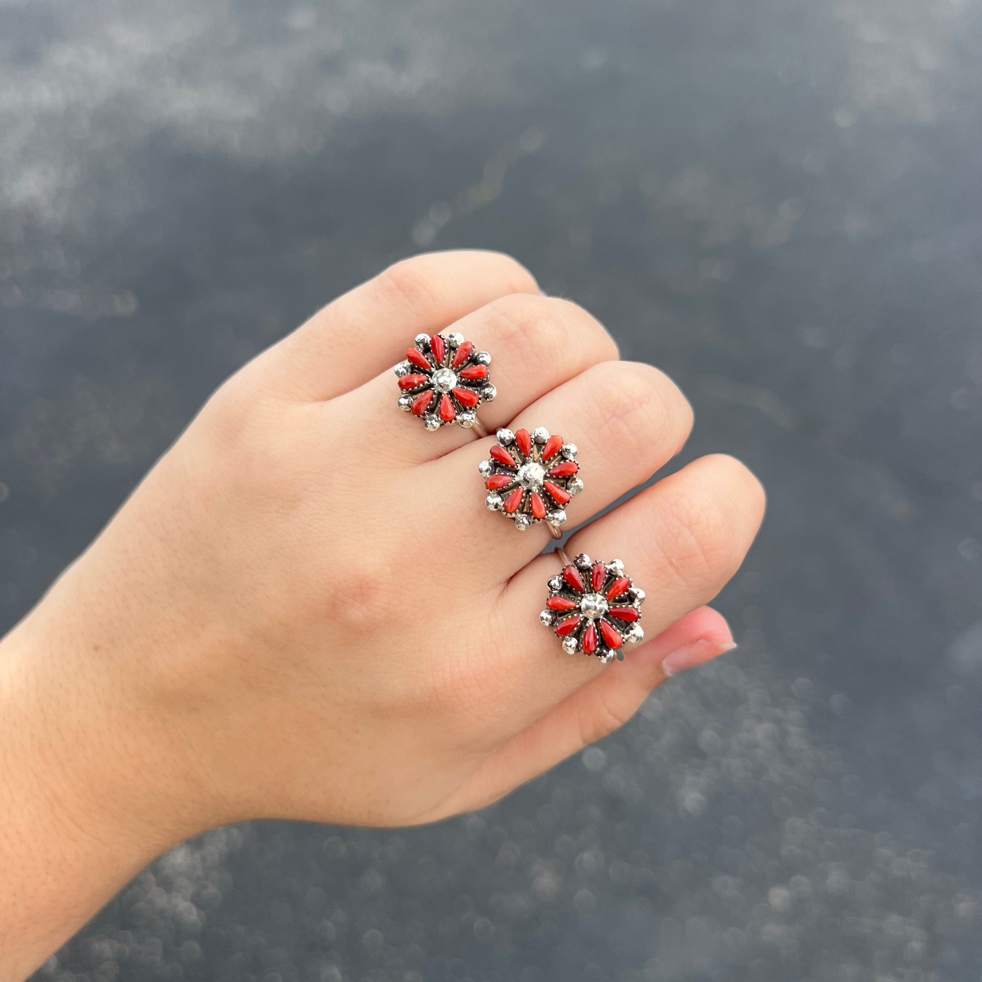 Genuine Coral Sterling Silver Petti Point Flower Cluster Ring