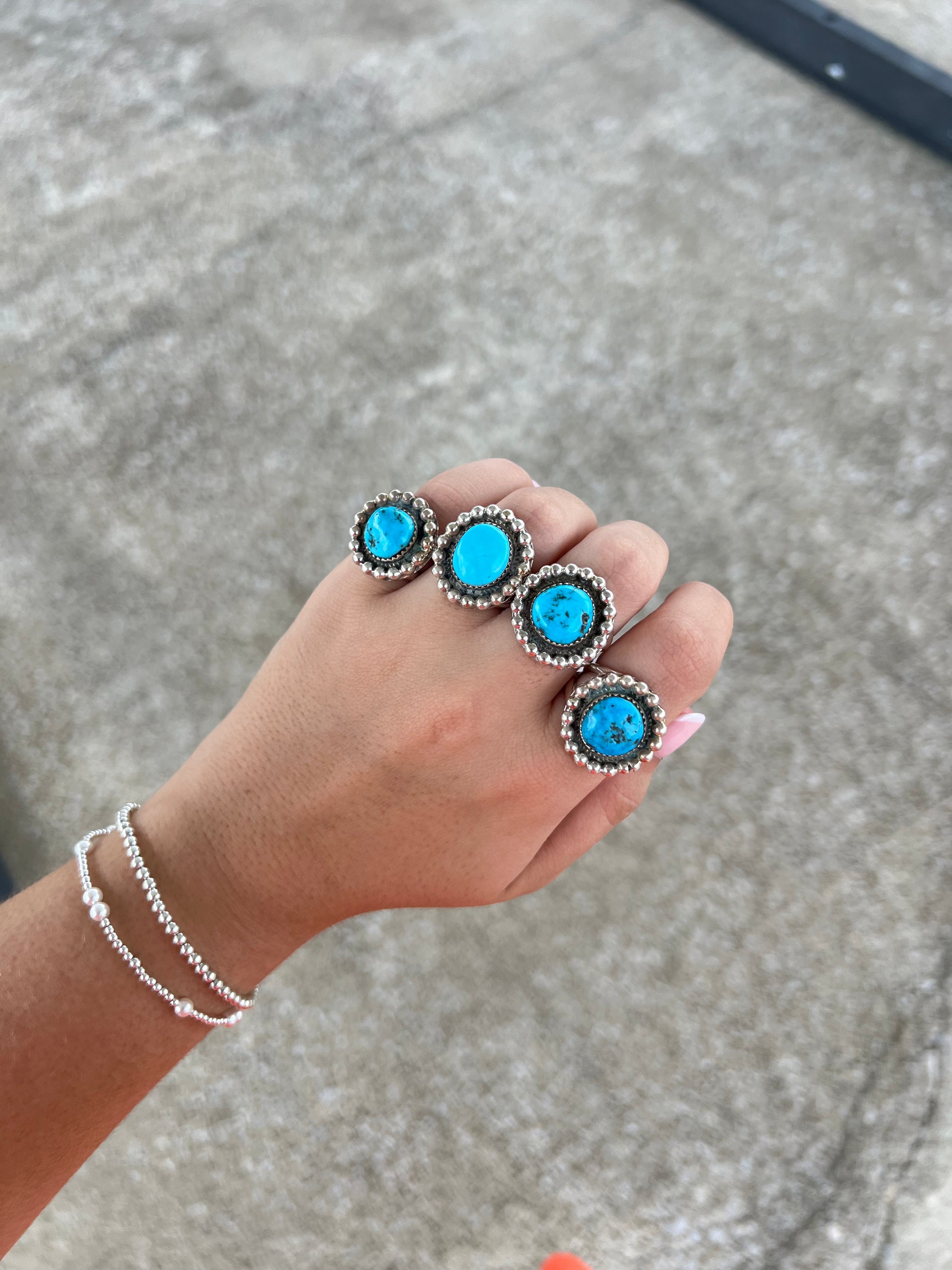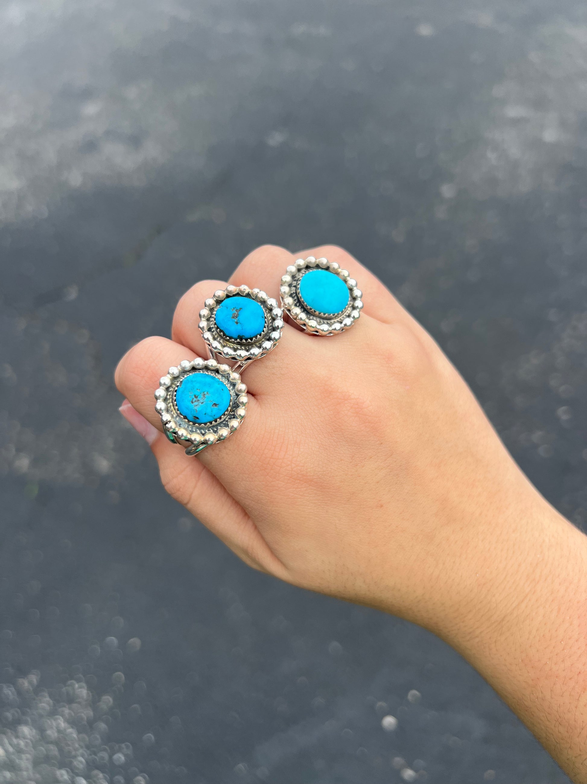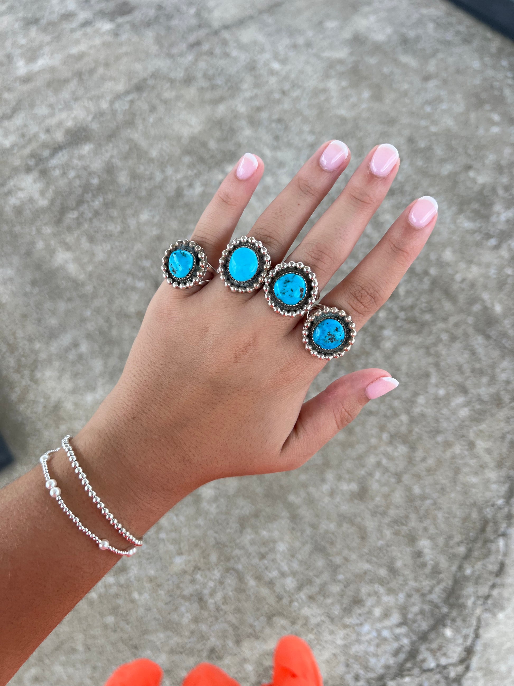 Genuine Kingman Turquoise Beaded Border Sterling Silver Ring