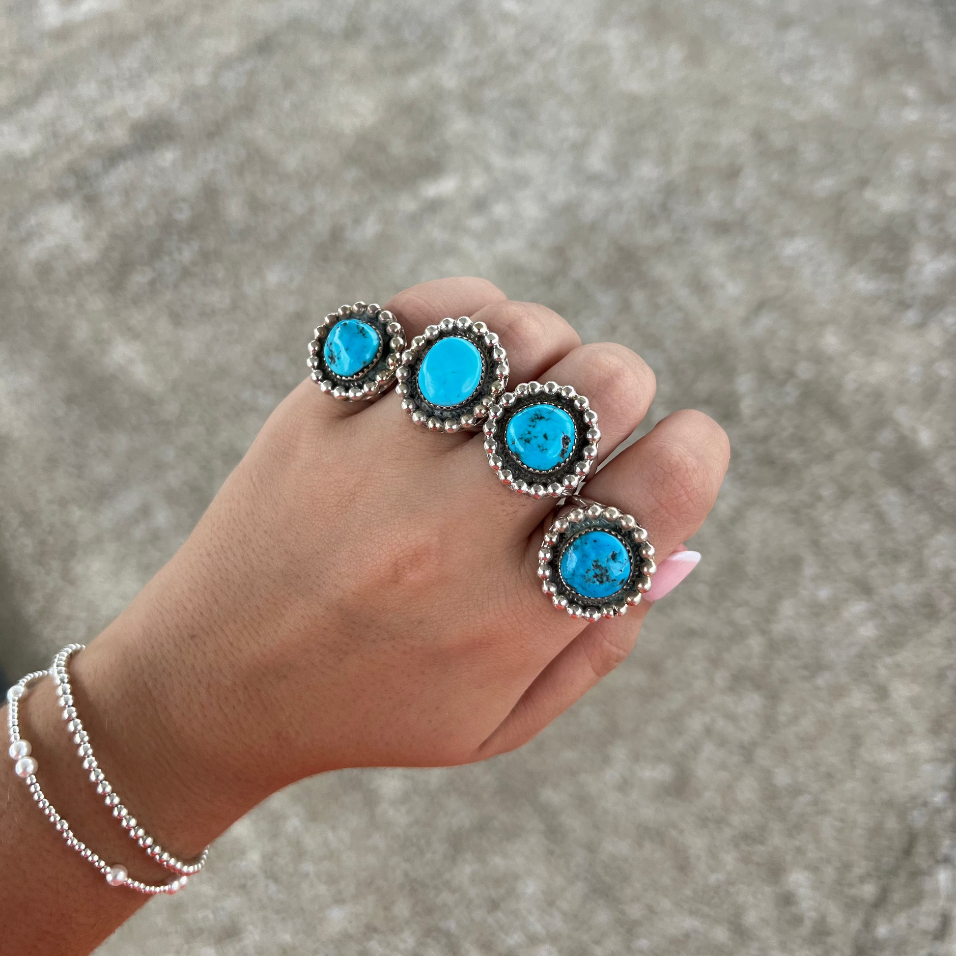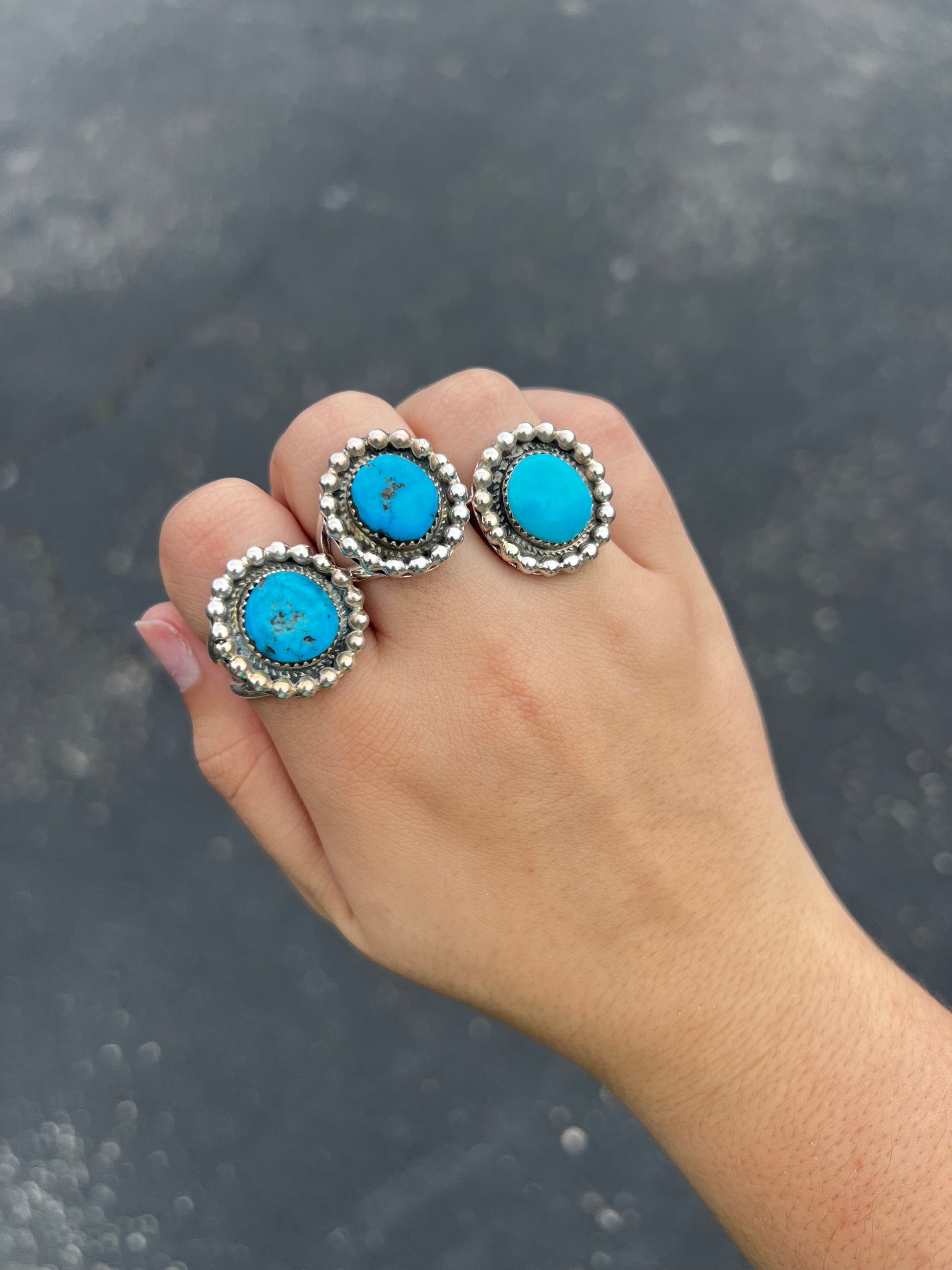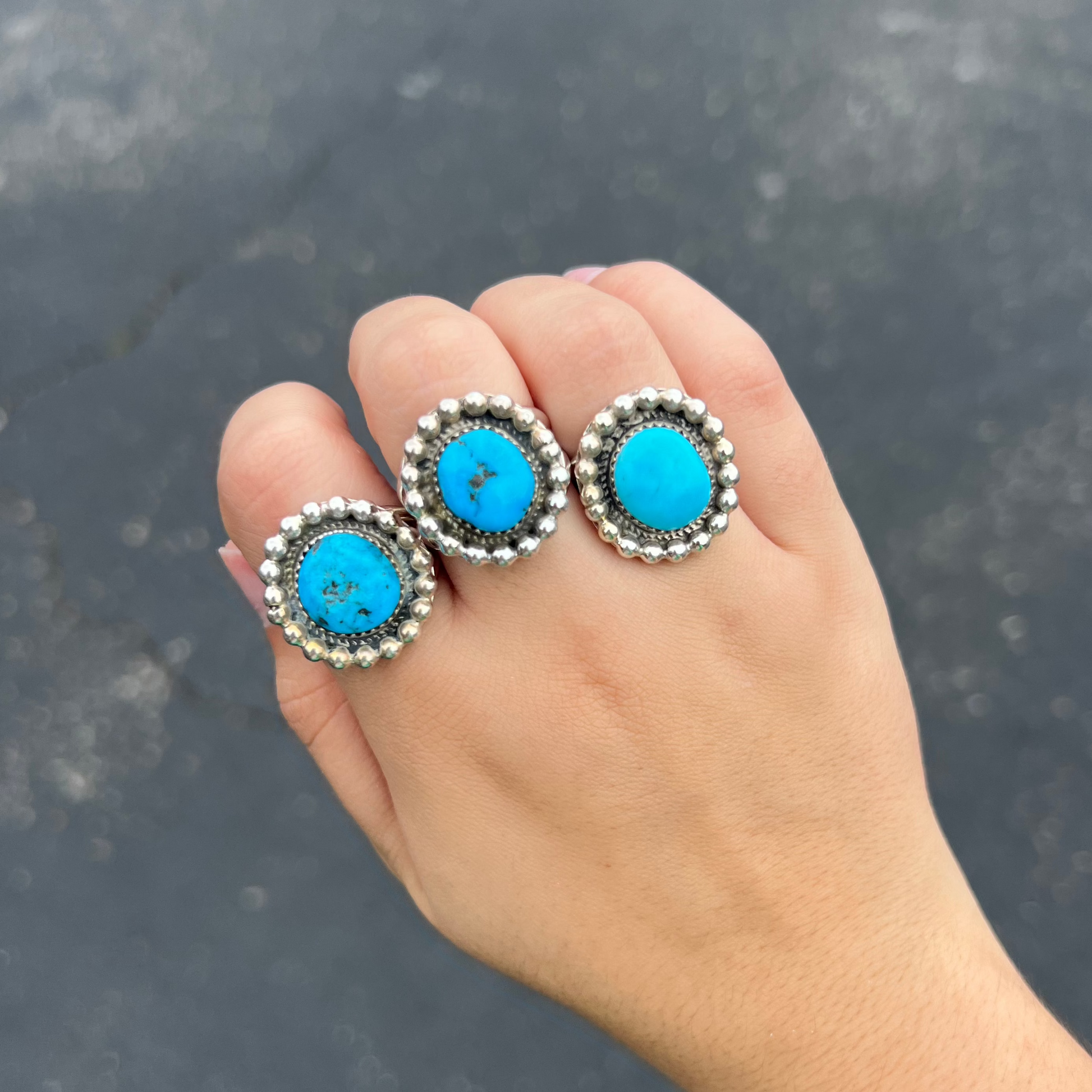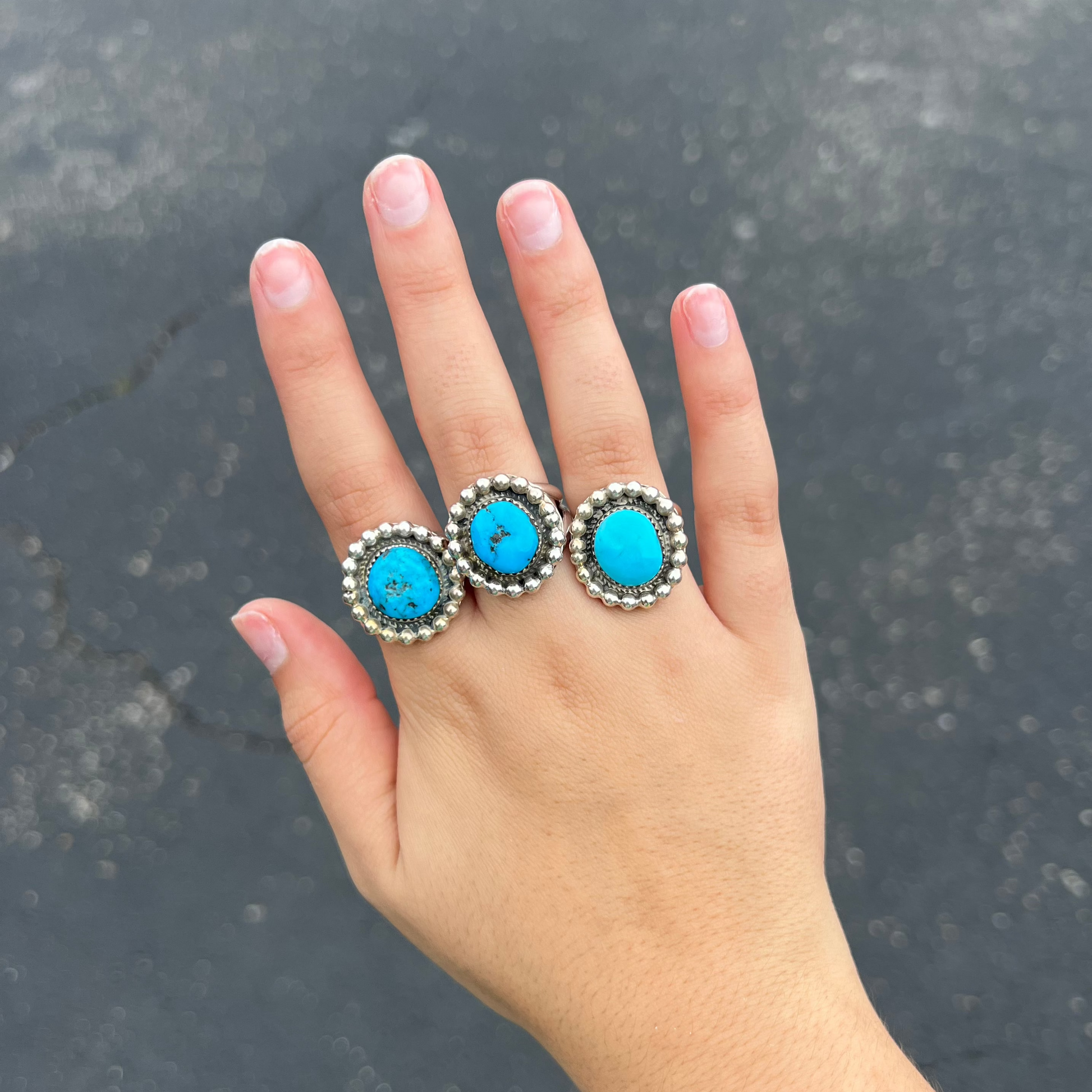 Genuine Kingman Turquoise Beaded Border Sterling Silver Ring