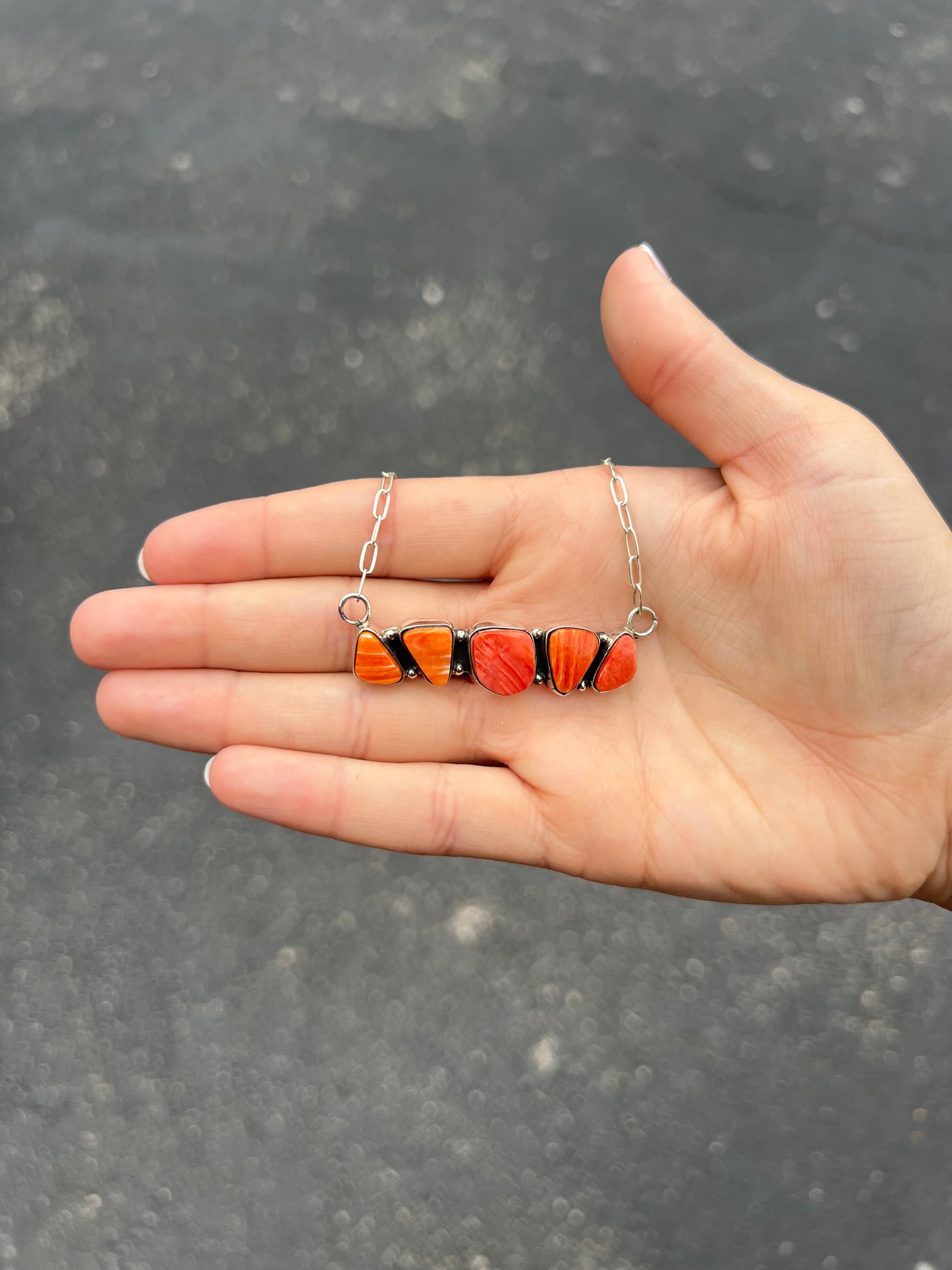 Genuine Orange and Red Spiny Oyster 5 Stone Bar Necklace