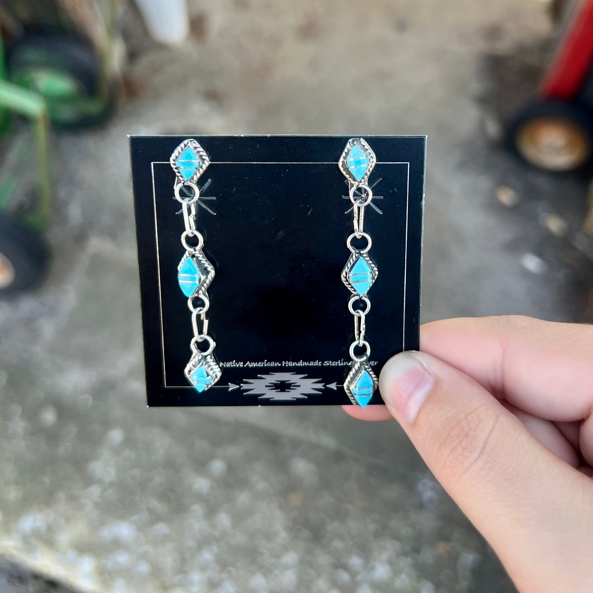 Genuine Turquoise 3 Stone Inlay Diamond Dangle Earrings