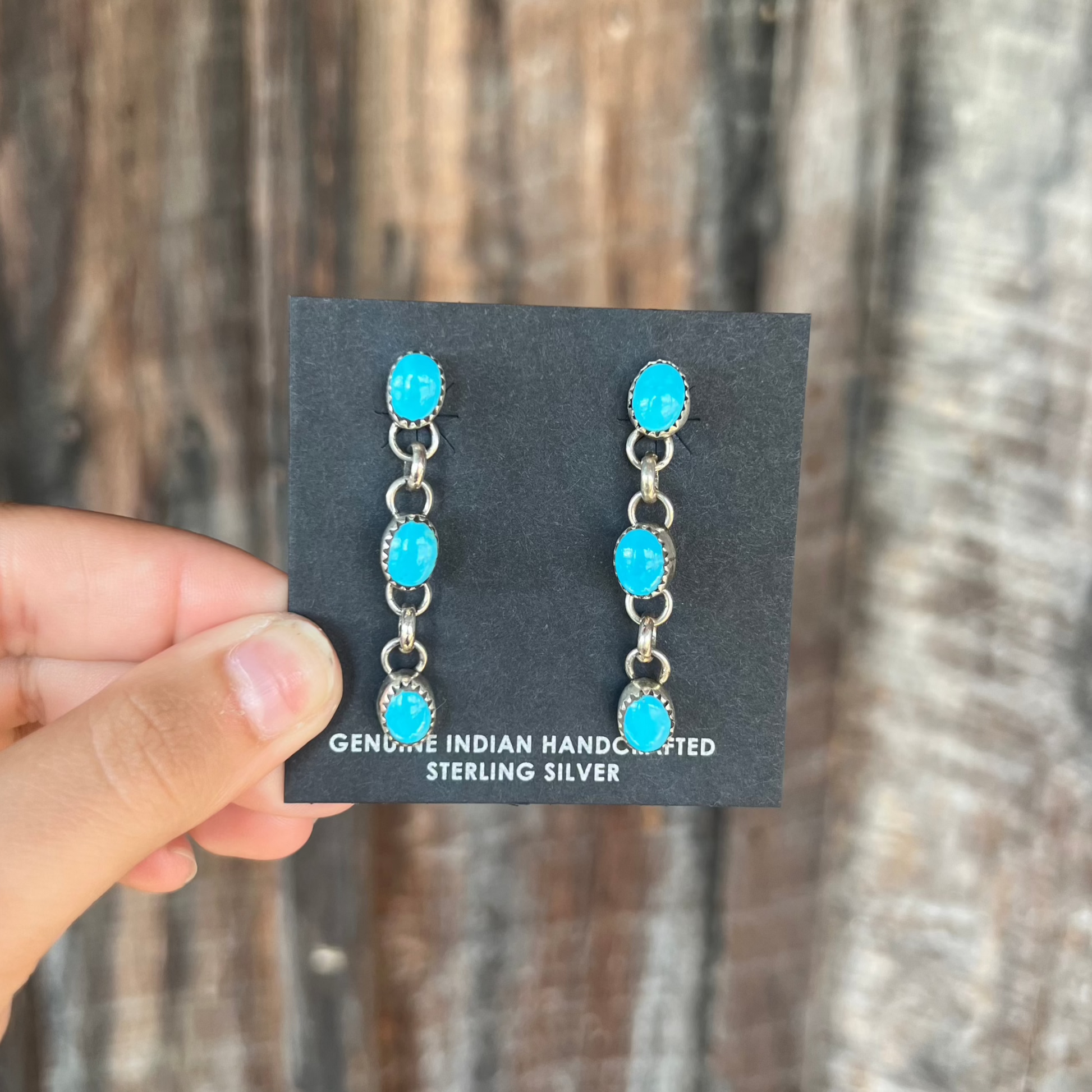 Genuine Turquoise 3 Stone Sleeping Beauty Sterling Silver Dangle Link Earrings