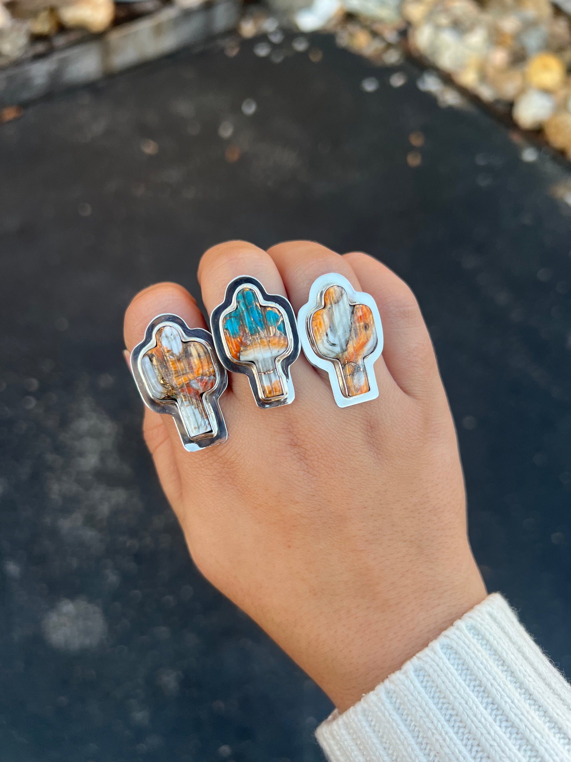 Genuine Turquoise and Orange Spiny Oyster Sterling Silver Cactus Ring