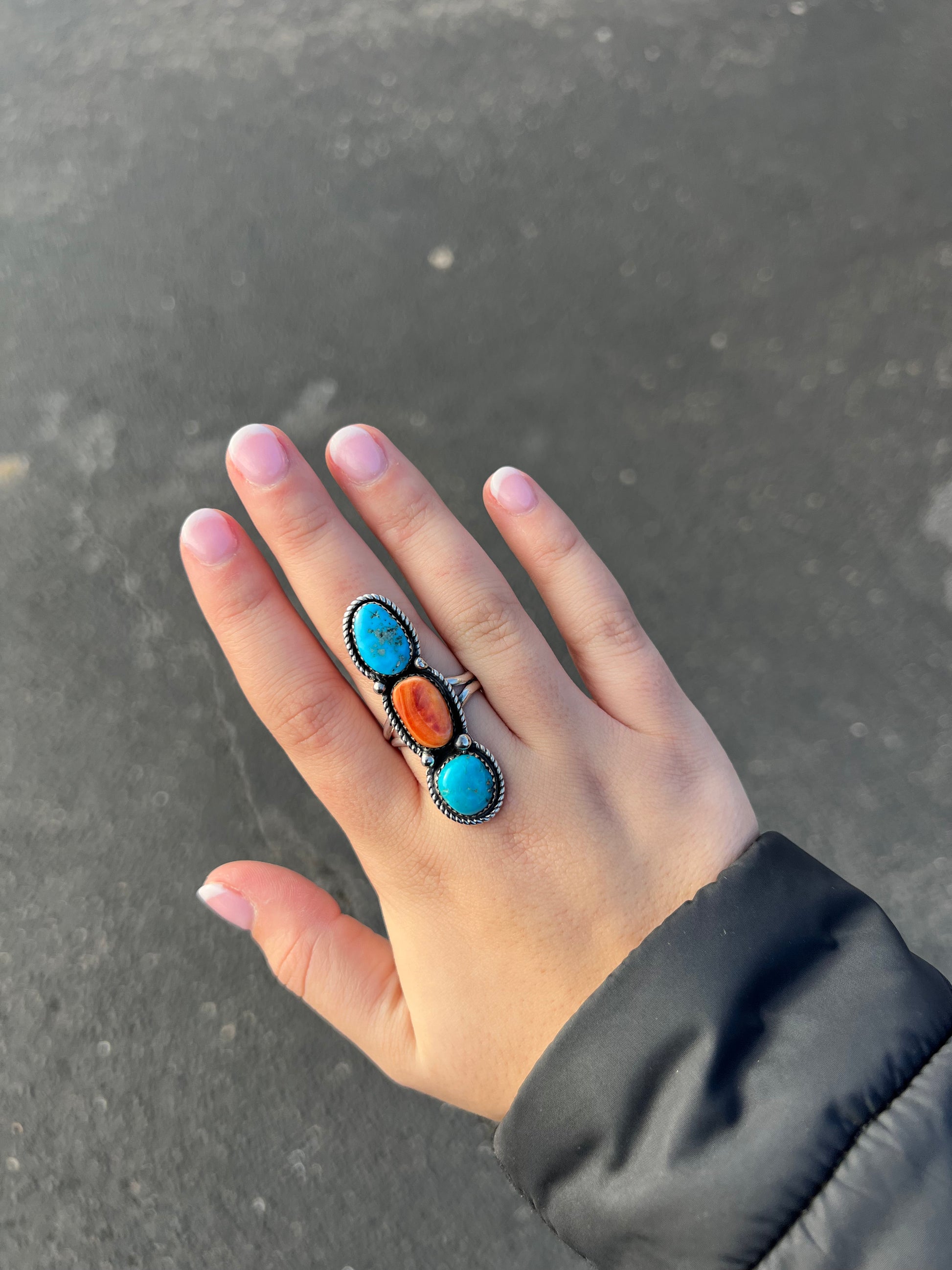 Genuine Turquoise and Spiny Oyster 3 Stone Sterling Silver Ring
