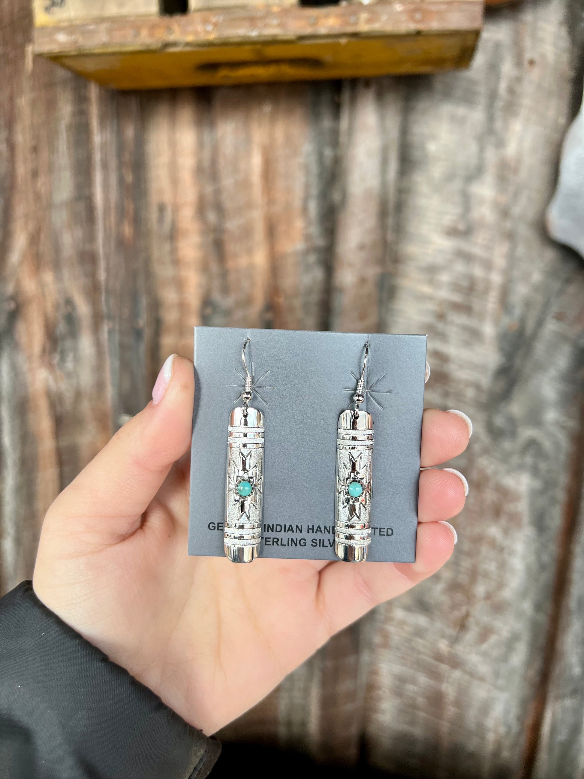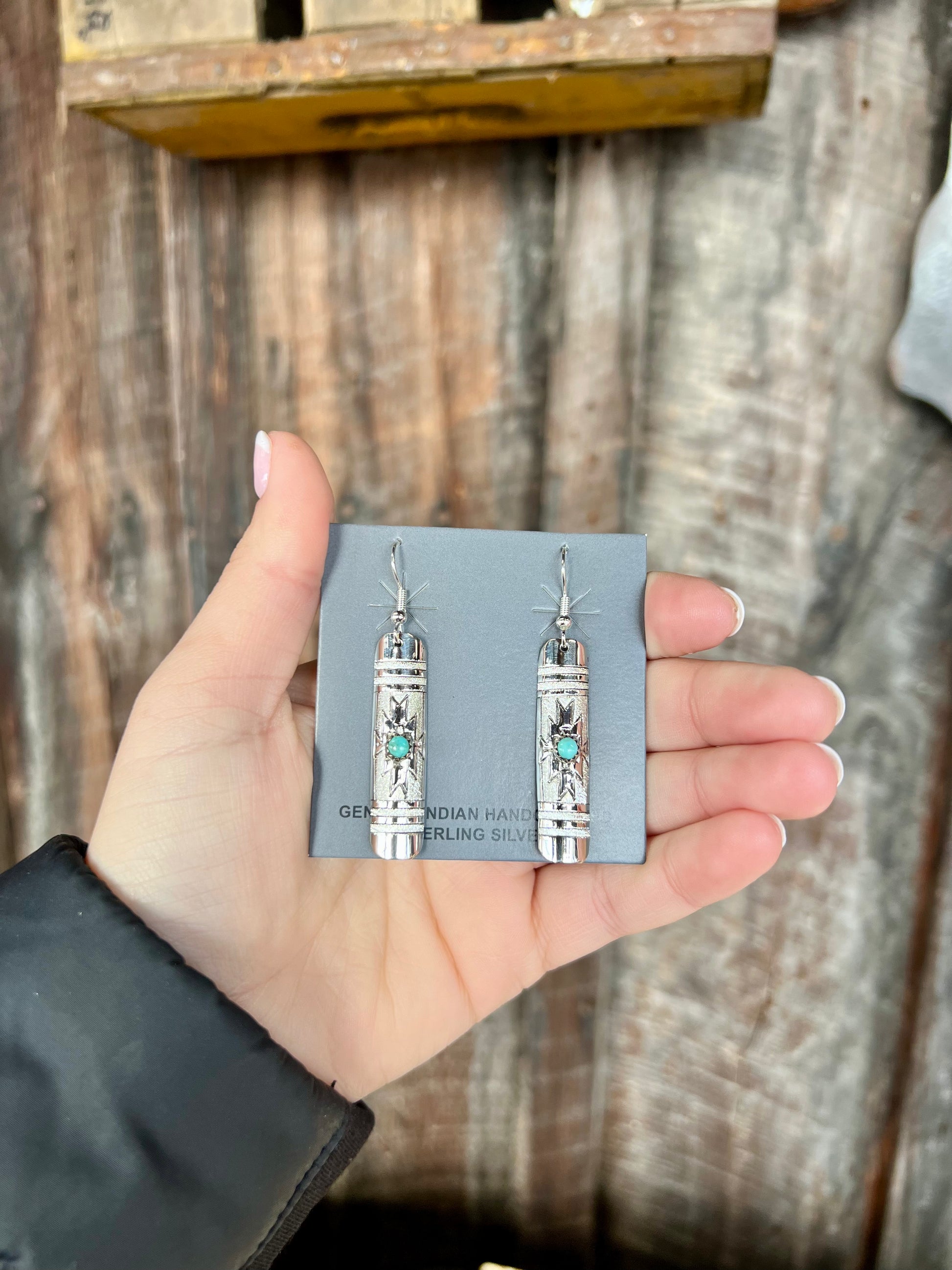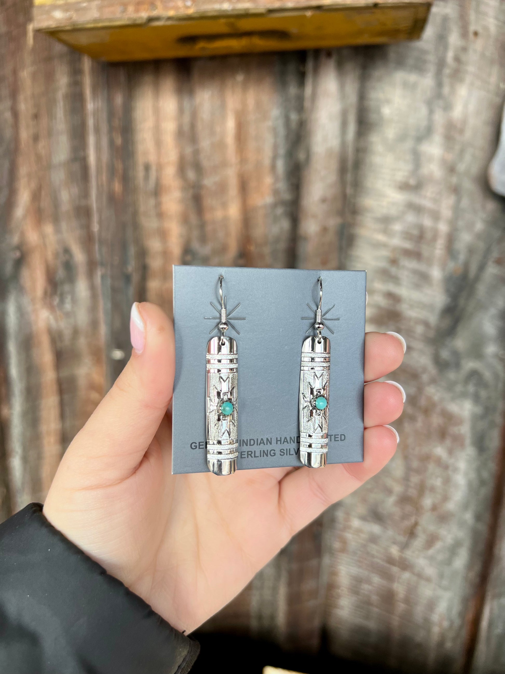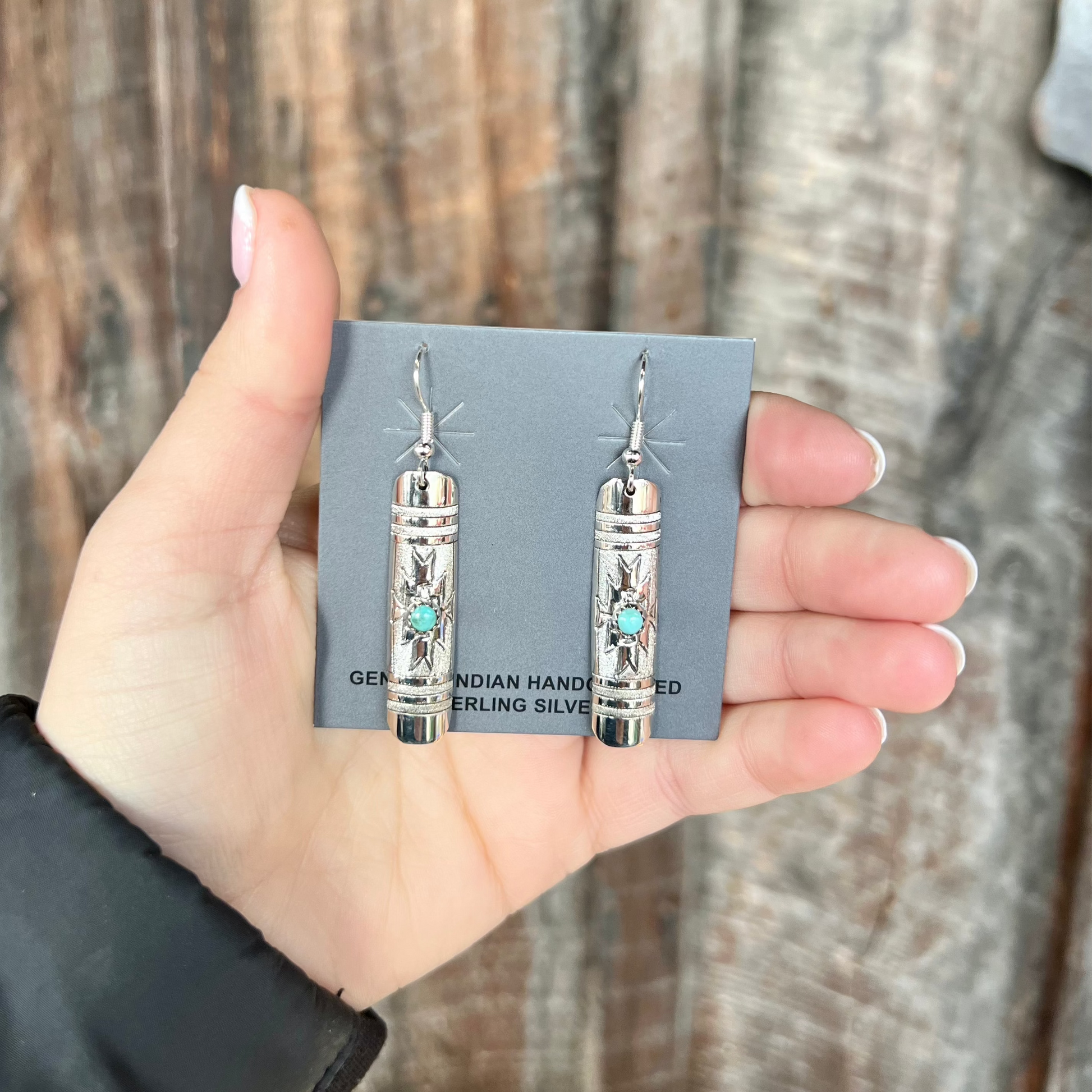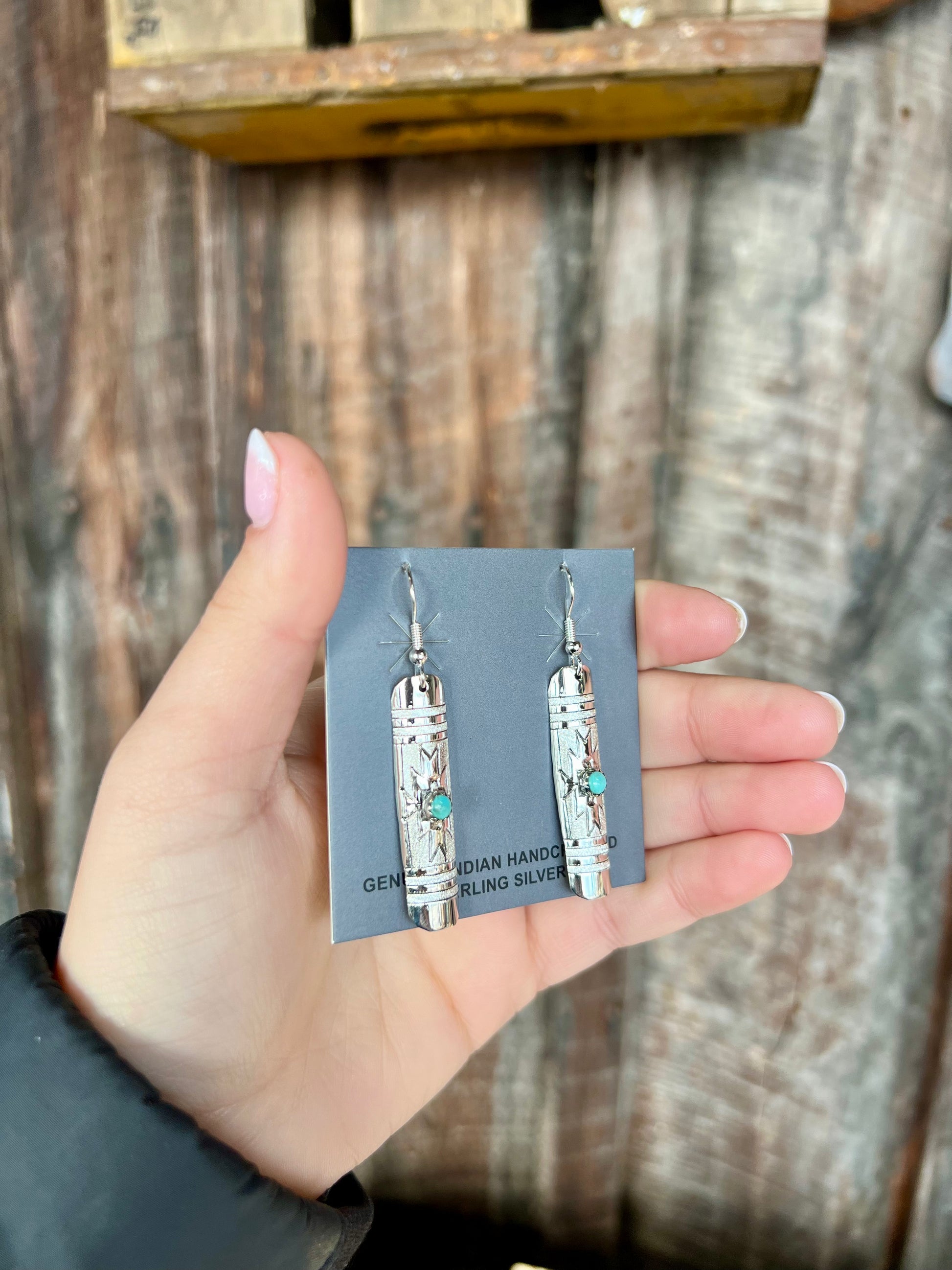 Genuine Turquoise Aztec Stamped Sterling Silver Rectangle Earrings