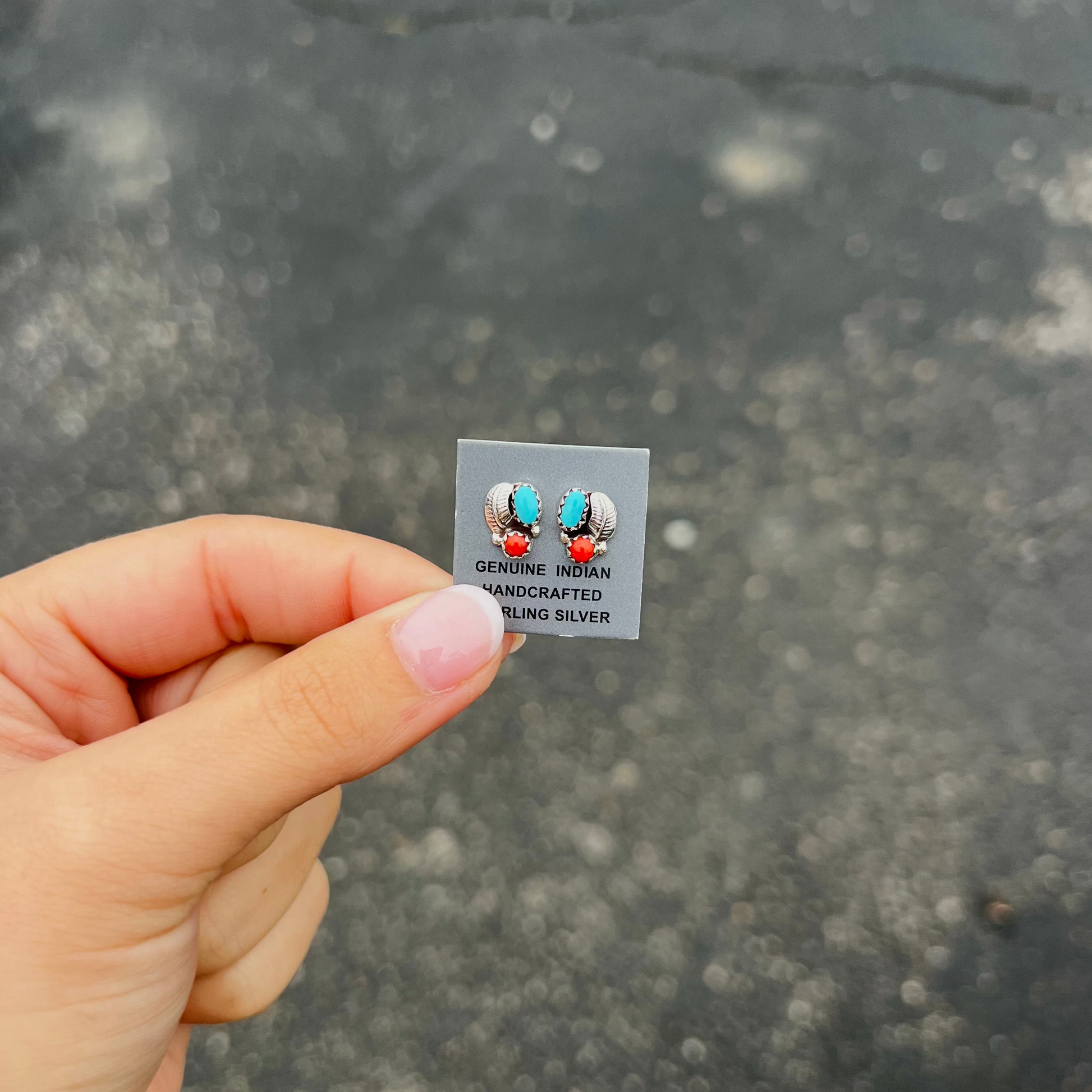 Genuine Turquoise, Coral, and Leaf Sterling Silver Studs