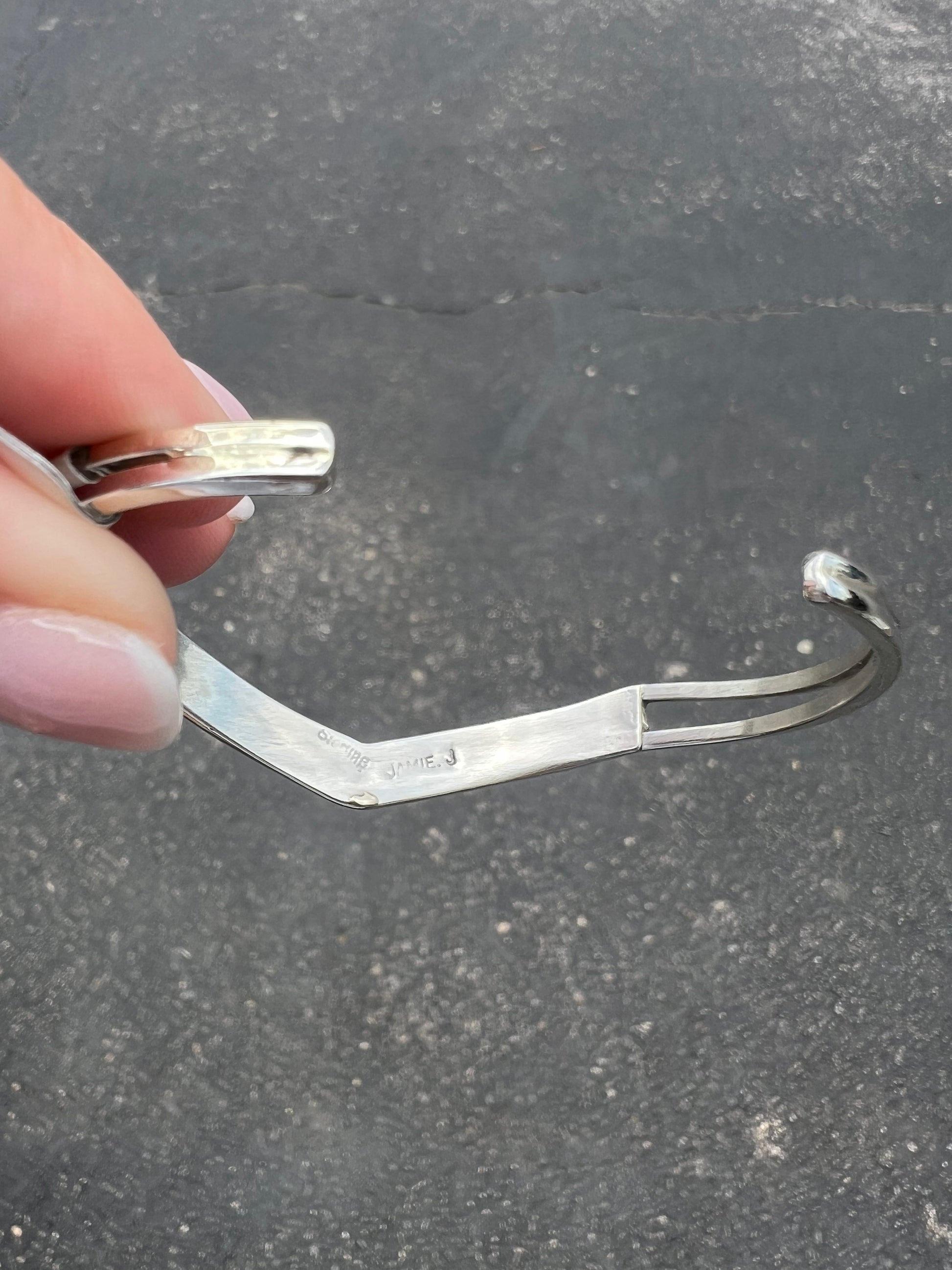 -Features 6 sections of inlay on a sterling Silver "V" shape sweater bracelet
