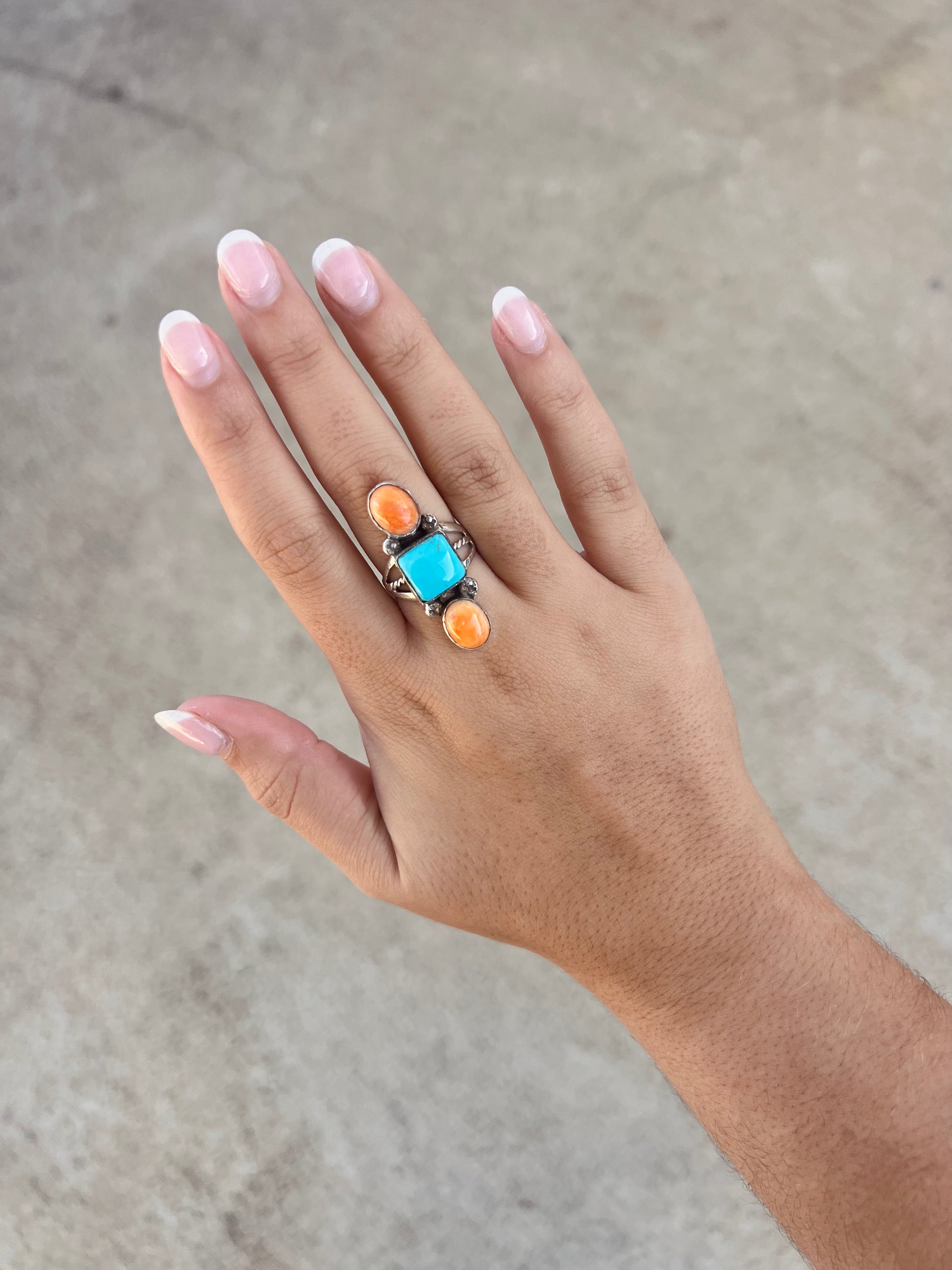 Genuine Turquoise & Spiny Oyster Sterling Silver 3 Stone Ring