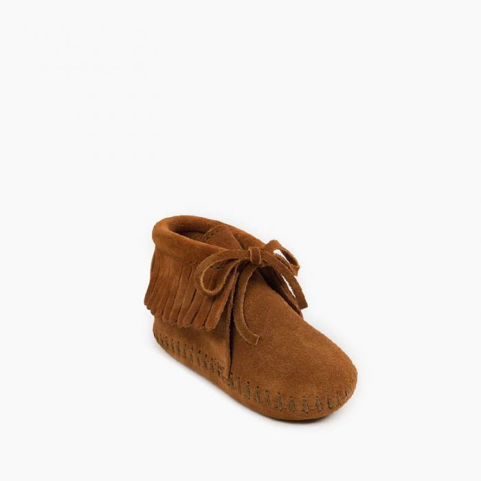 Its supple leather will form to their foot with every step while its padded footbed will keep them completely cozy in the meantime. A simple tie closure promises easy on and off. A layer of fringe and hand-stitched details make these infant moccasins beloved by children all over the world.