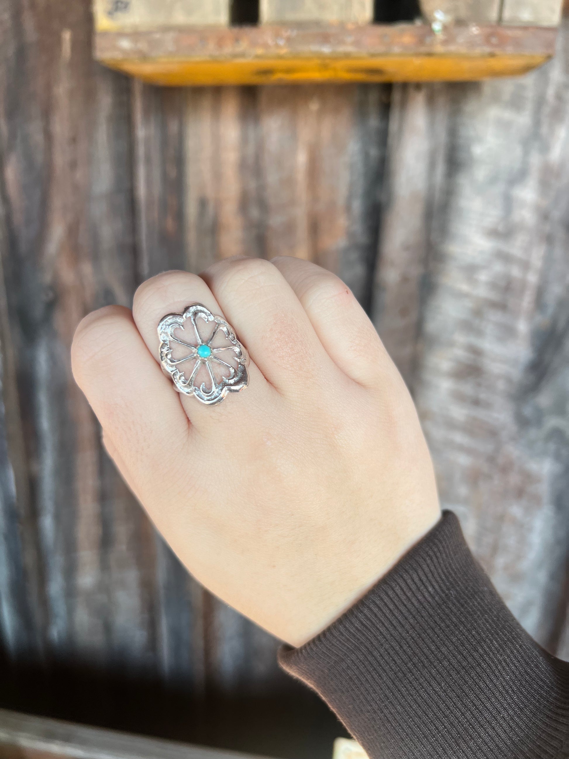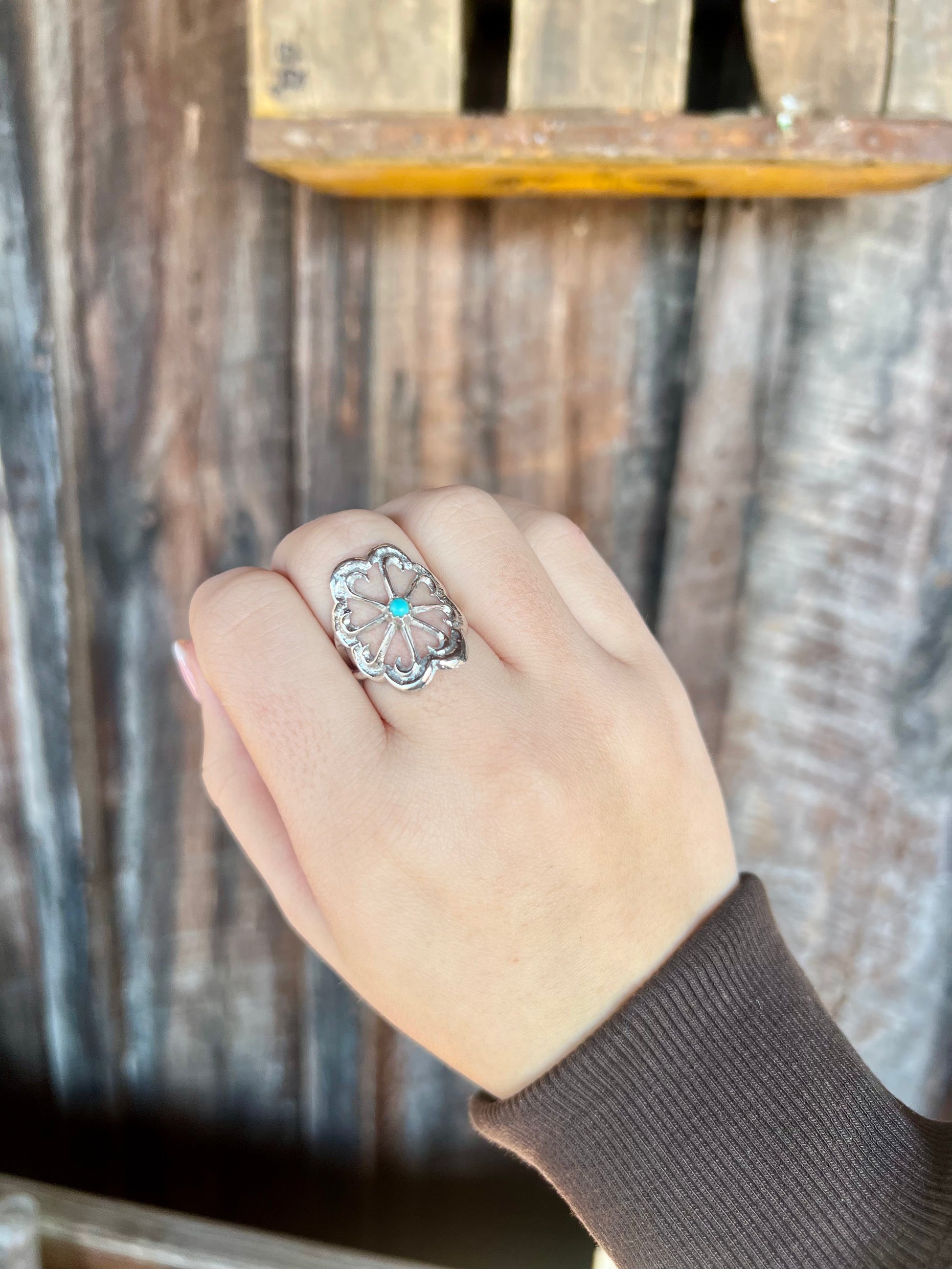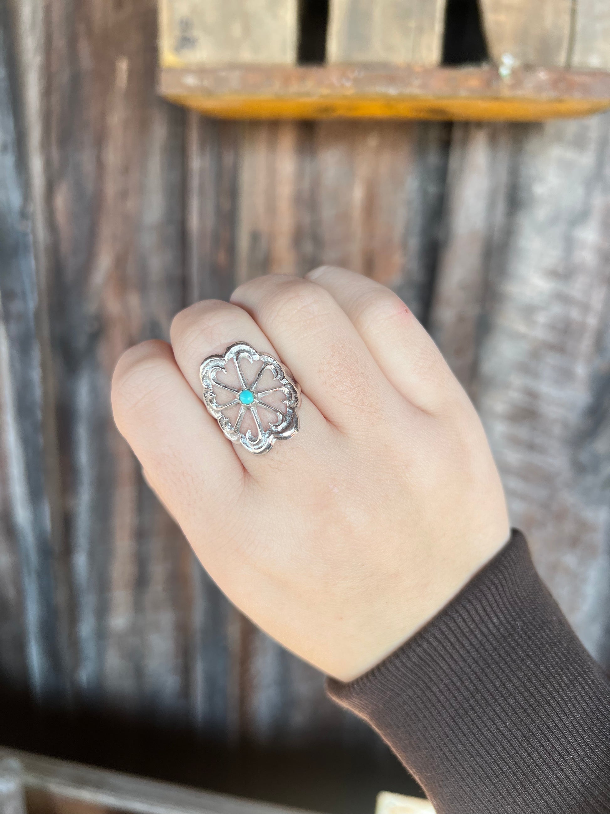 Sterling Silver Sand Cast Flower with Turquoise Stud Ring