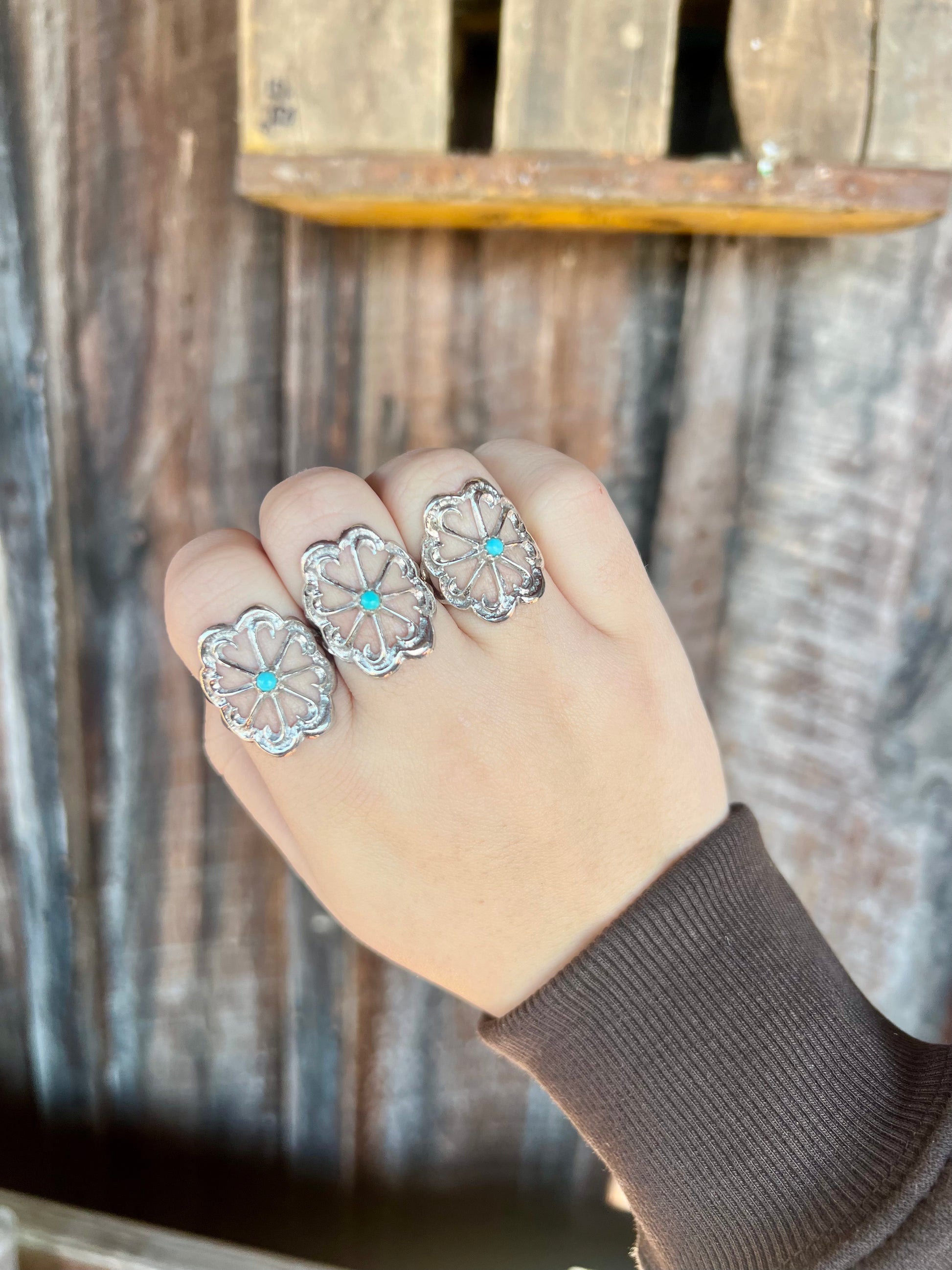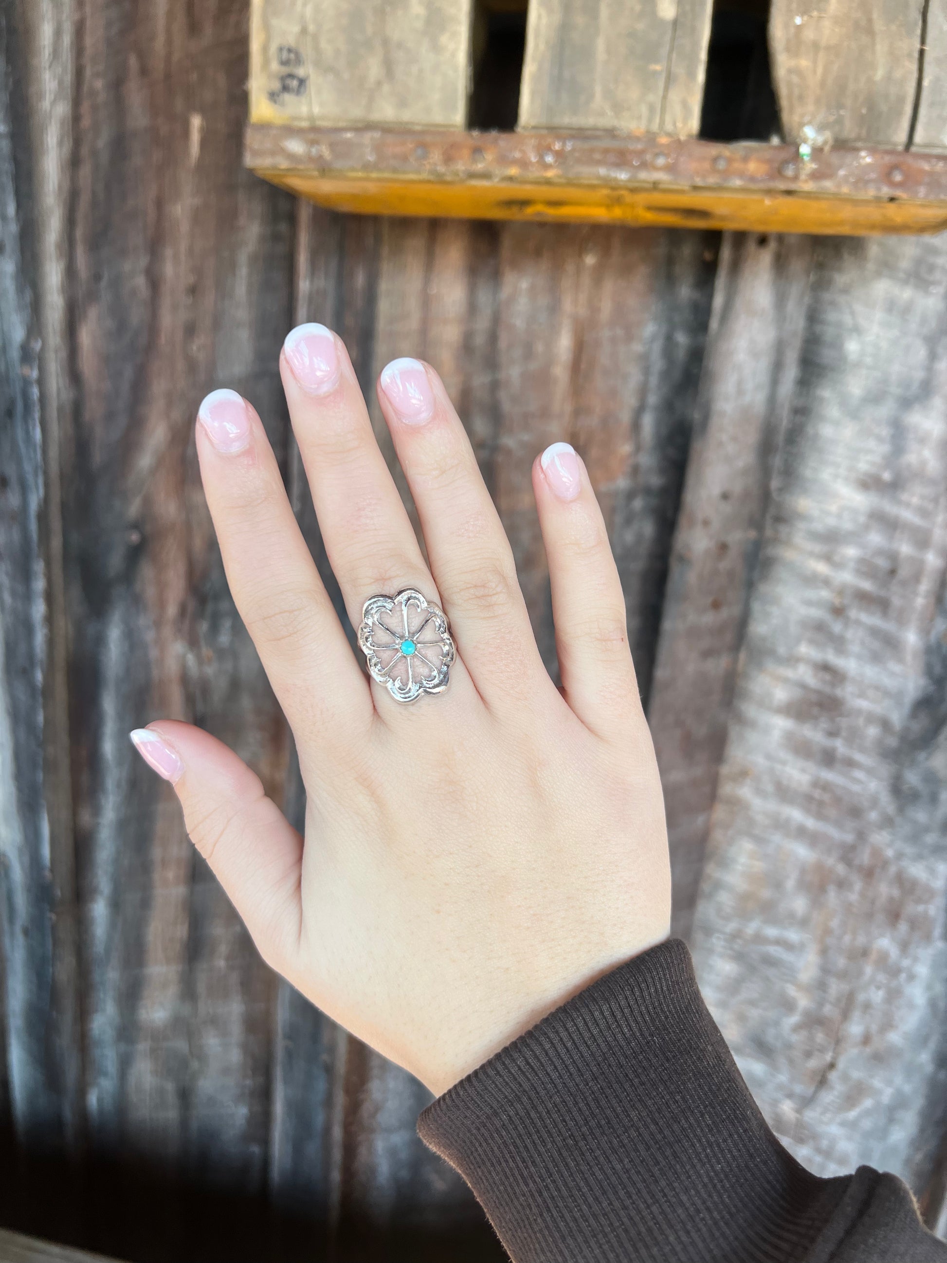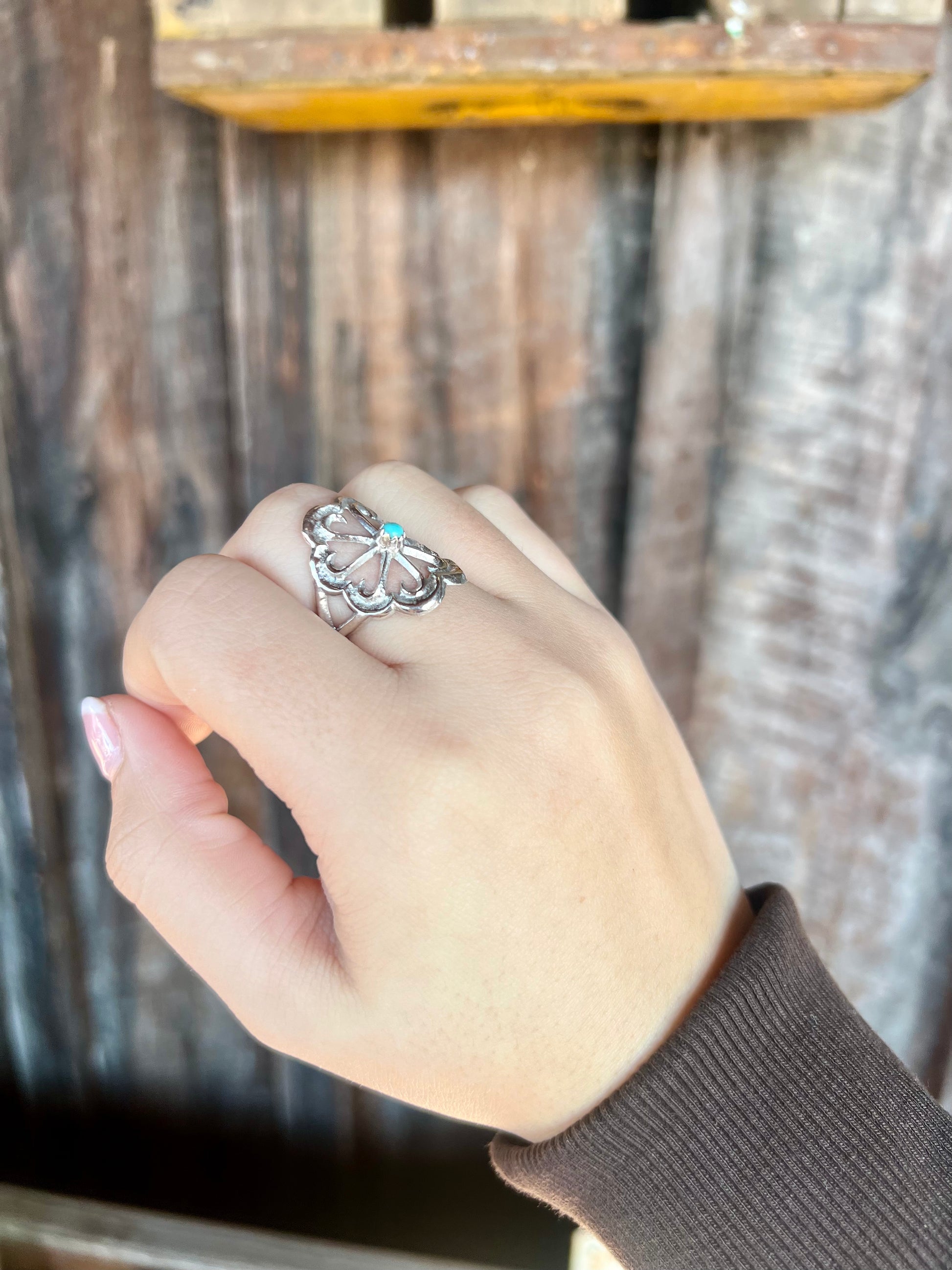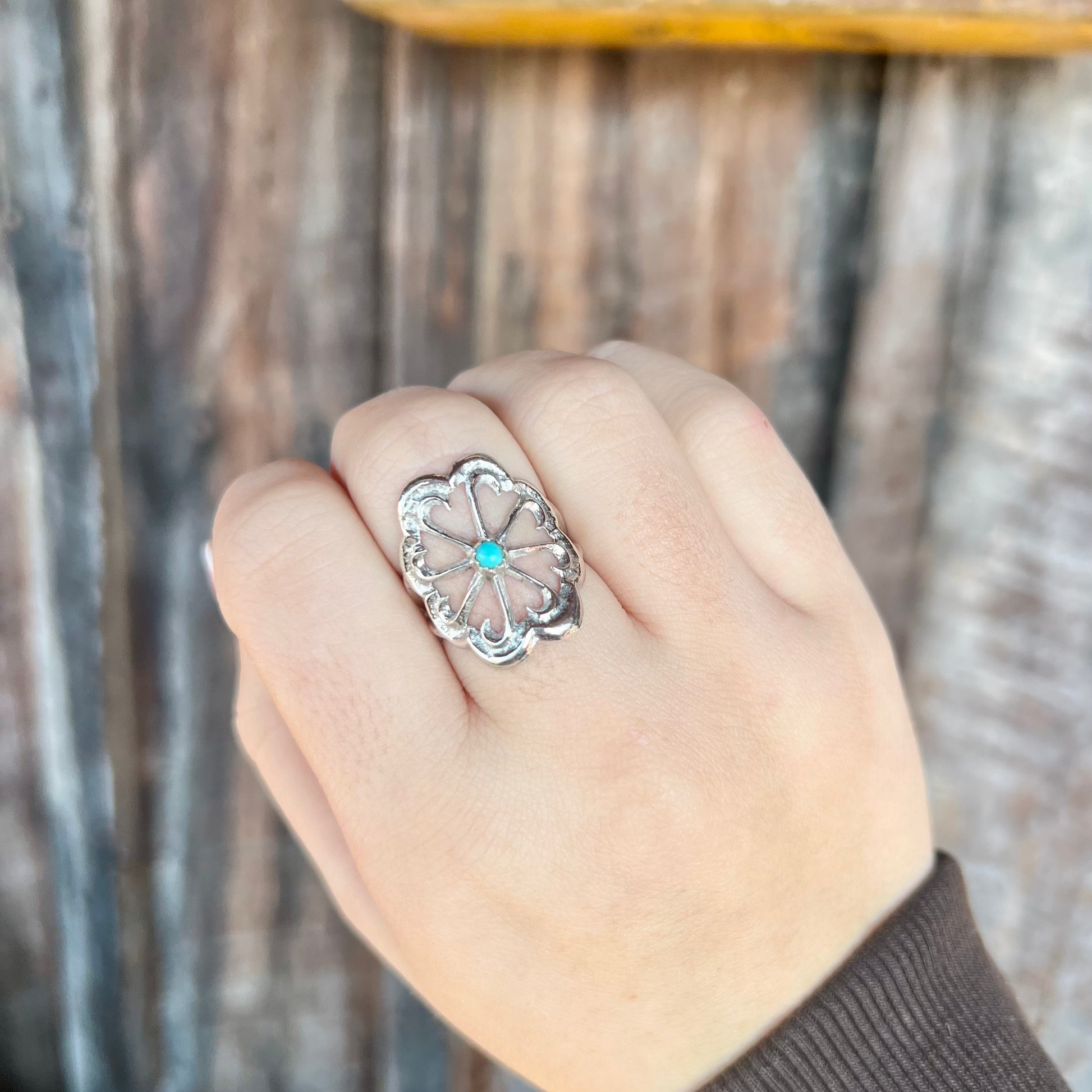 Sterling Silver Sand Cast Flower with Turquoise Stud Ring
