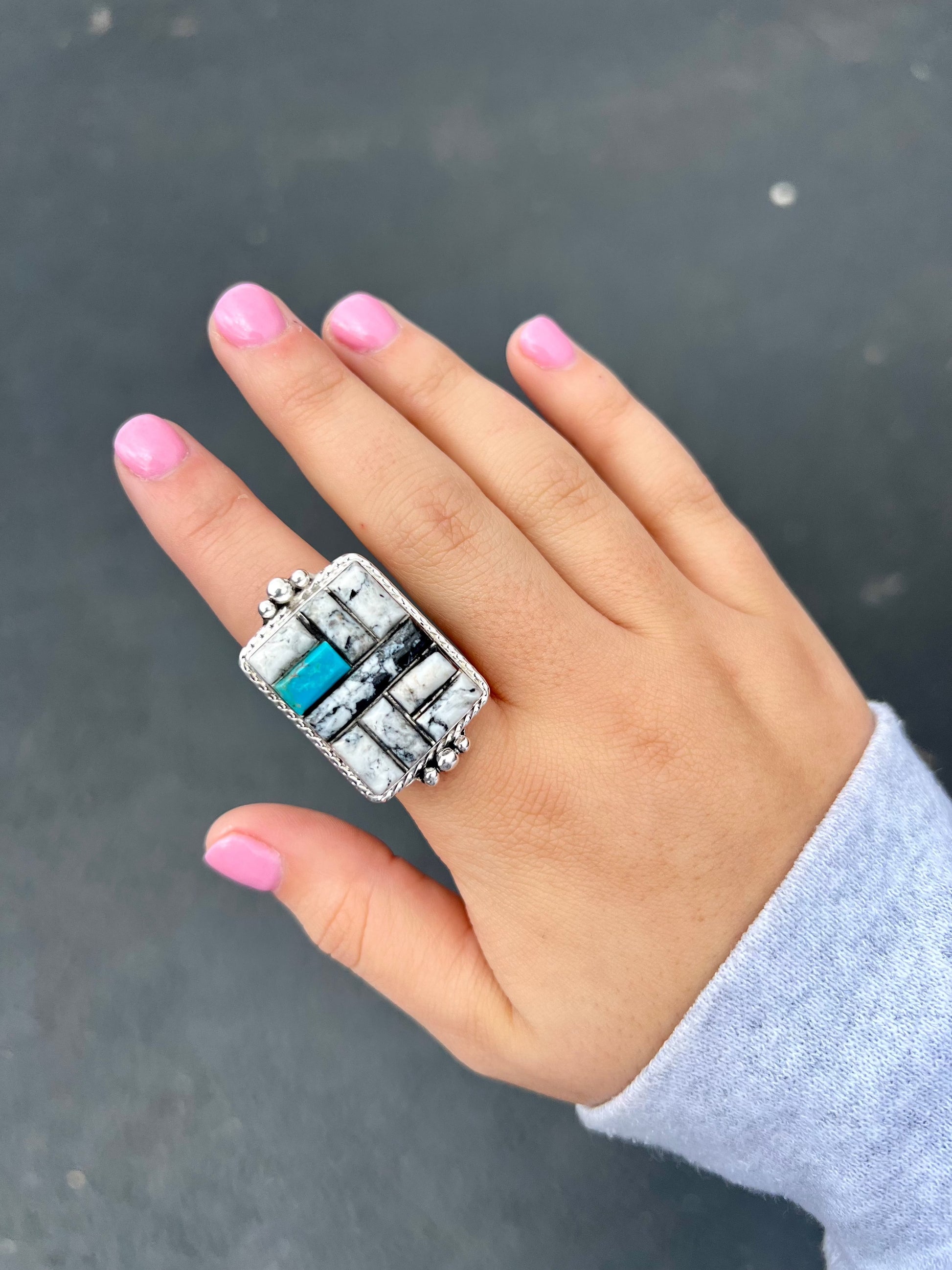 -Sterling Silver Ring with White Buffalo and Turquoise
